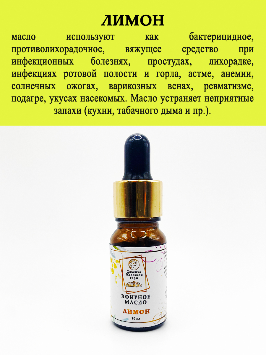 Лимон - масло используют как бактерицидное, противолихорадочное, вяжущее средство при инфекционных болезнях, простудах, лихорадке, инфекциях ротовой полости и горла, астме, анемии, солнечных ожогах, варикозных венах, ревматизме, подагре, укусах насекомых. Масло устраняет неприятные запахи (кухни, табачного дыма и пр.).