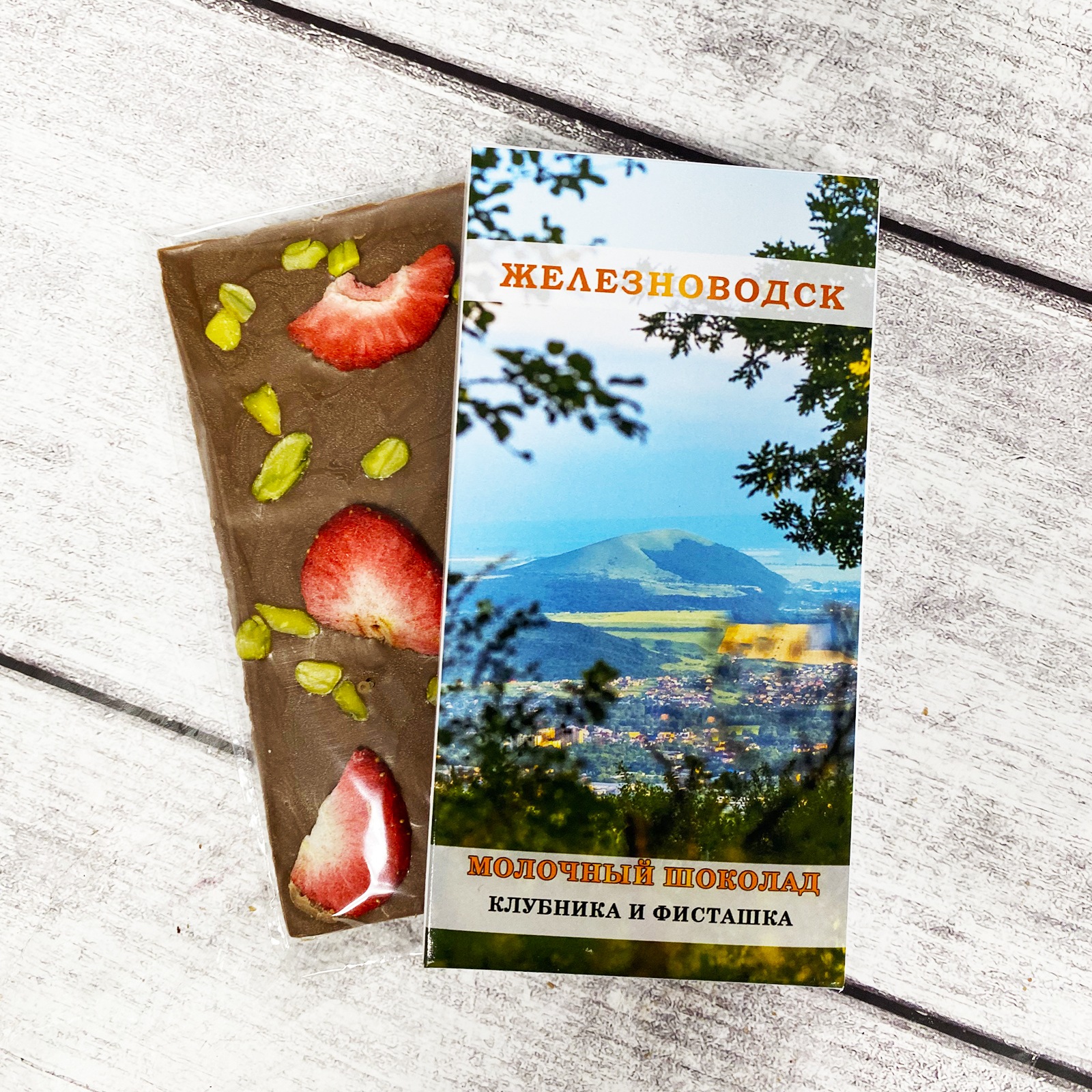 сахар, масло какао, сухое цельное молоко, какао тертое, эмульгатор: лецитины (соя), натуральный ароматизатор: ваниль. Начинка: клубника, лепестки фисташки