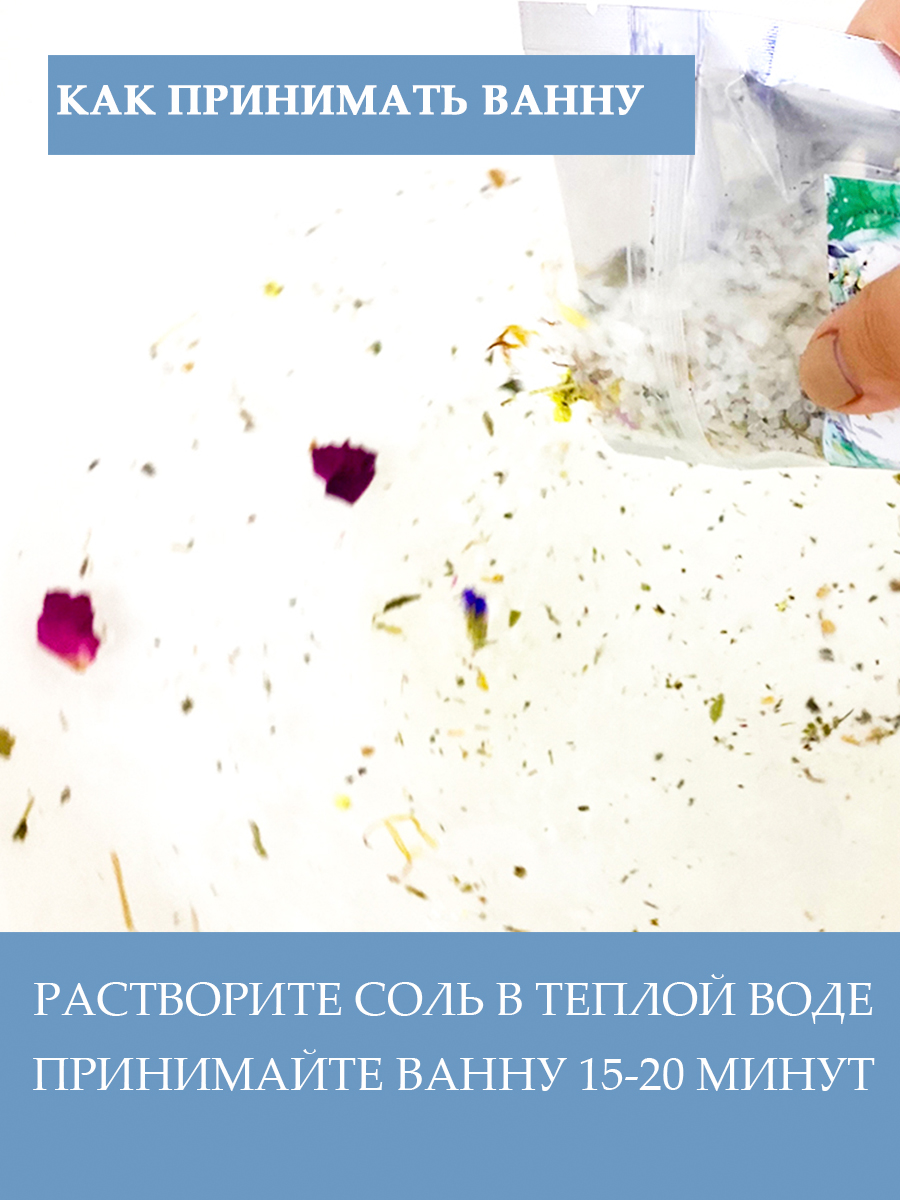 Способ применения: высыпать содержимое пакета в ванну с теплой водой. Принимать 15-25 минут, после рекомендуется смыть теплой водой.
