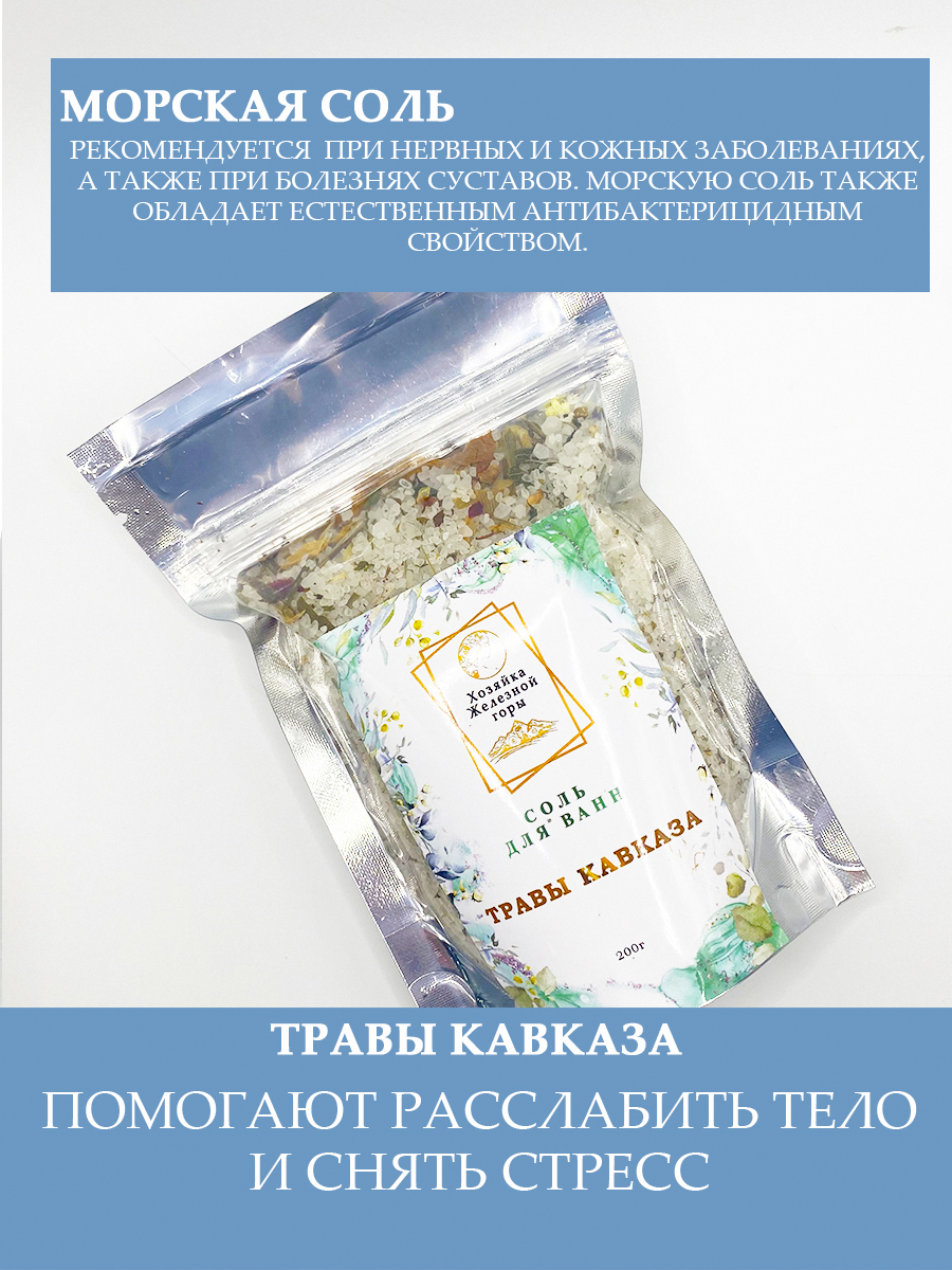 Соль для ванн "Травы Кавказа" - это не просто соль, это настоящее удовольствие для ваших чувств. Она создана из морской соли с добавлением натуральных эфирных масел и трав Кавказа, которые богата минералами и микроэлементами, необходимыми для поддержания здоровья кожи