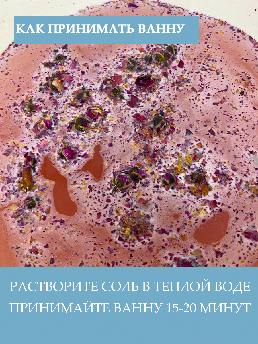 В момент растворения соль красиво шипит и переливается украшая воду молочным цветом и лепестками цветов. Такая ванна станет незабываемой.