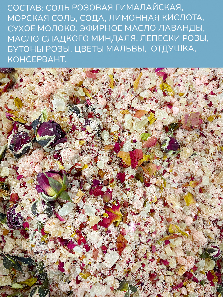 Состав: соль морская, гималайская розовая соль, сода, лимонная кислота, сухое молоко, эфирное масло лаванды, масло сладкого миндаля, лепестки розы, бутоны розы, цветы мальвы, отдушка, консервант.