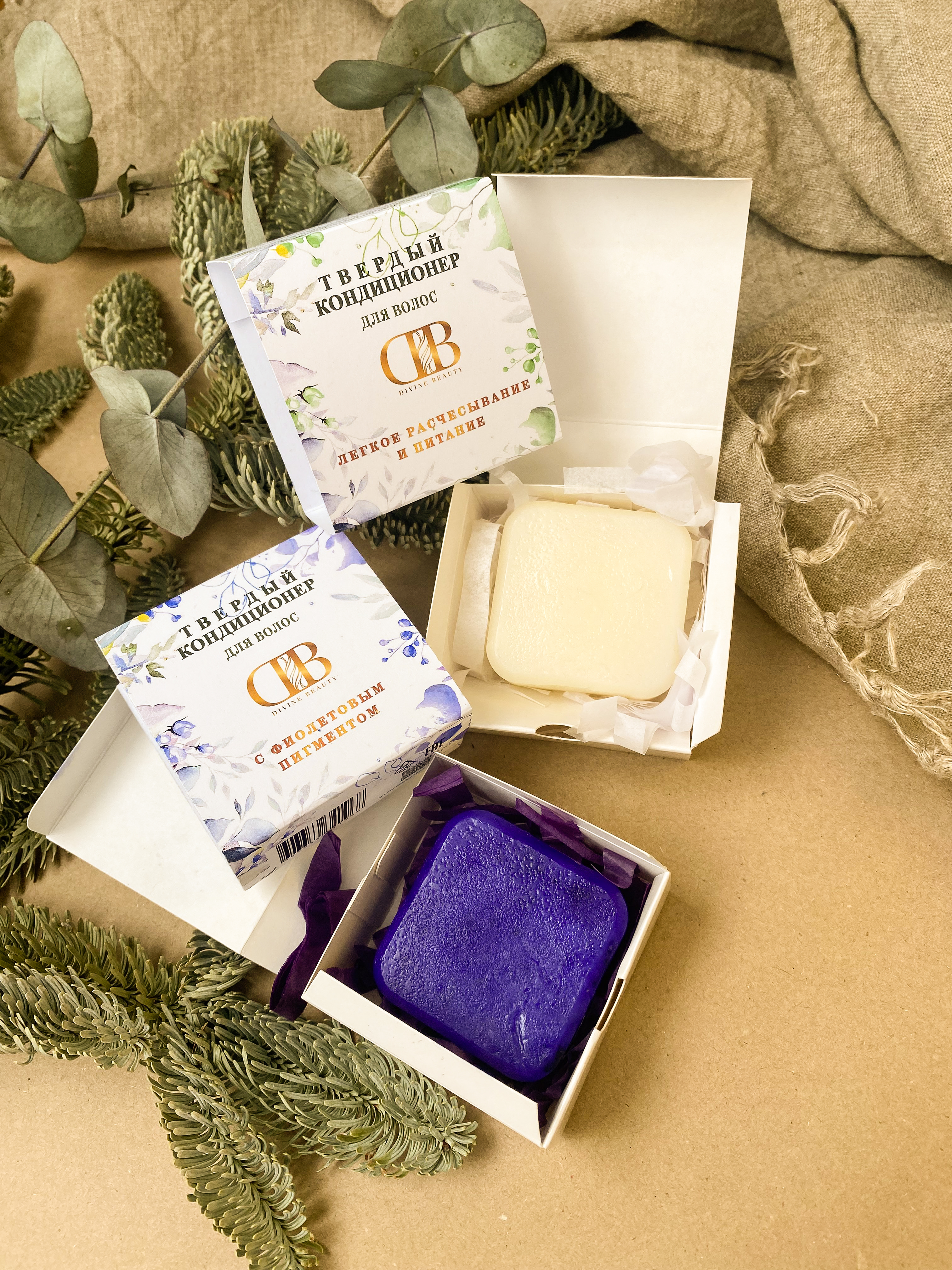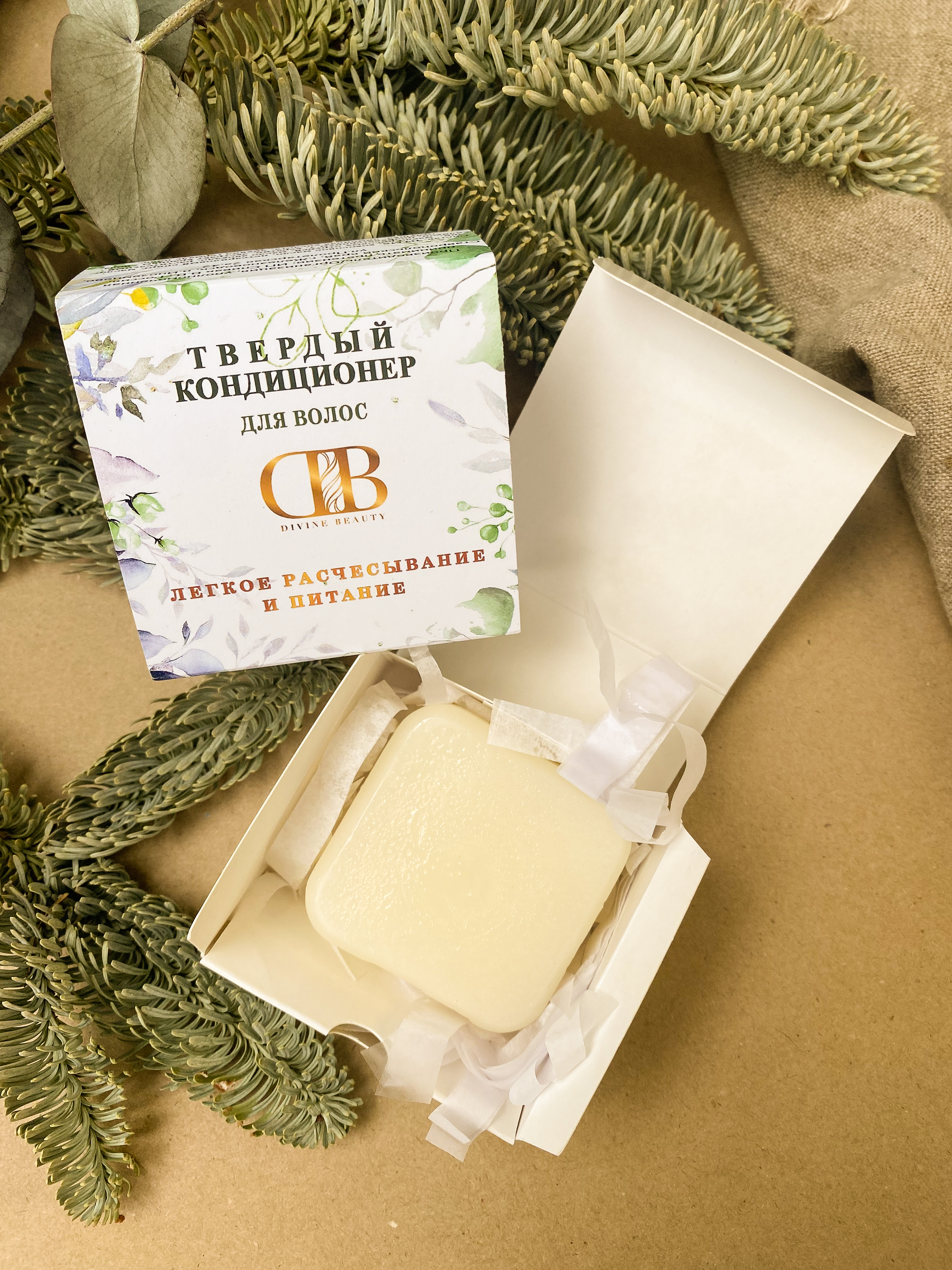 Твердый кондиционер для волос - это концентрат, который легко использовать, брать с собой в путешествие или спортзал. Обеспечивает интенсивное питание по всей длине, восстанавливает структуру, предотвращает ломкость, облегчает расчесывание, запаивает секущиеся кончики. Придает волосам блеск и защищает цвет. Идеально подходит для сухих, поврежденных, окрашенных и секущихся волос.
