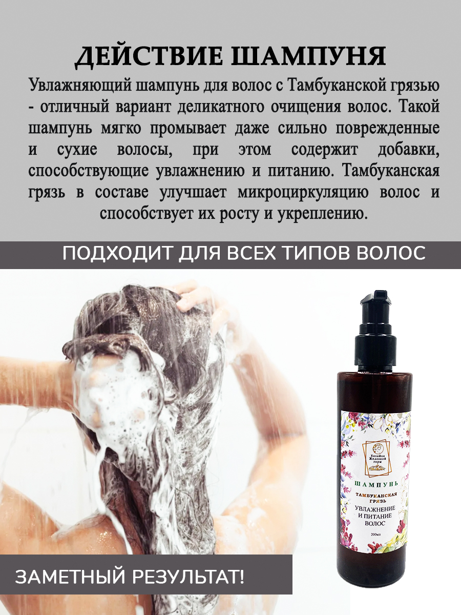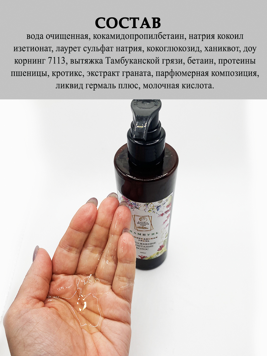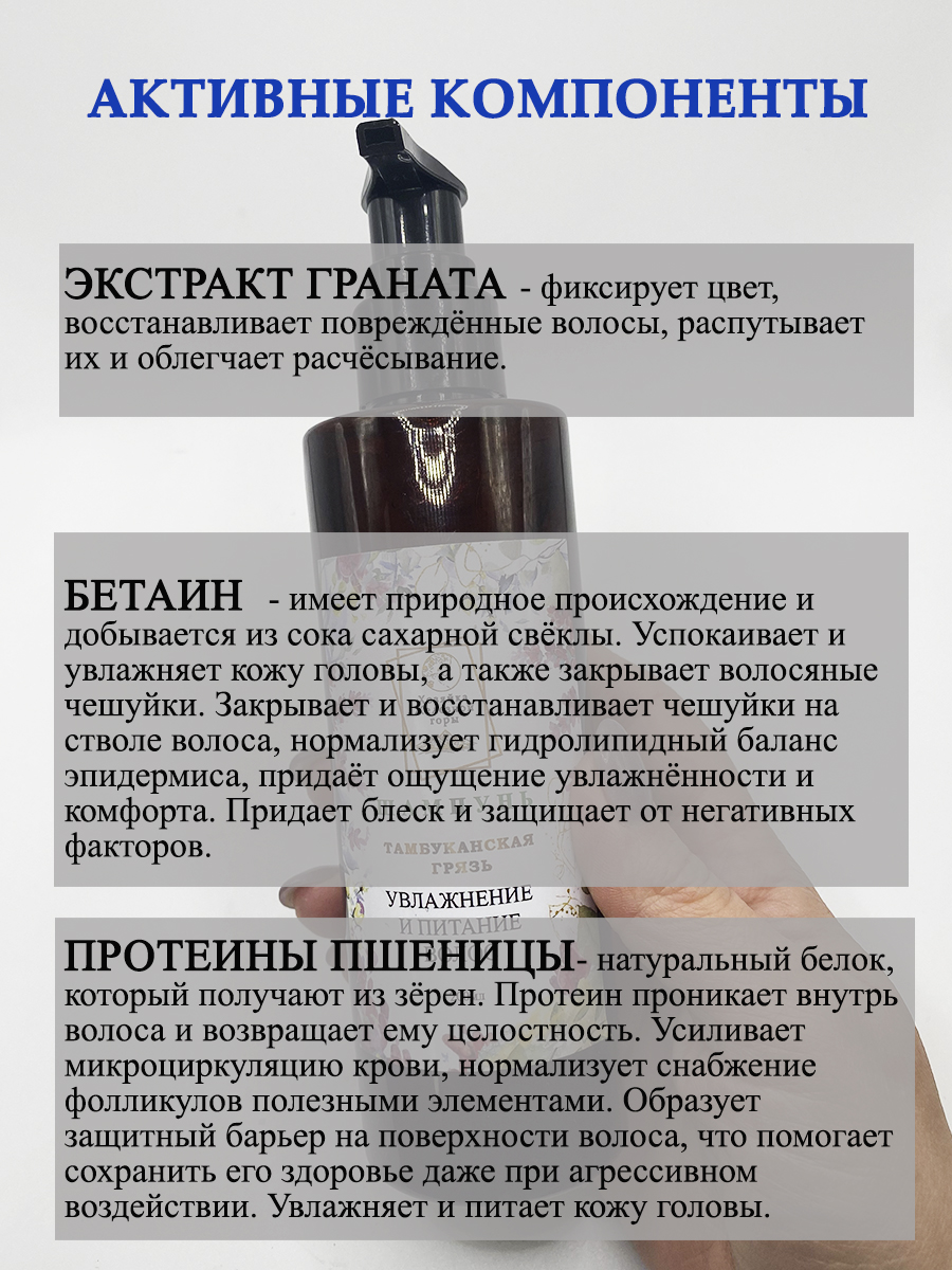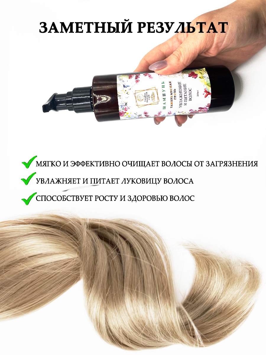 Увлажняющий шампунь для волос с Тамбуканской грязью - отличный вариант деликатного очищения волос. Такой шампунь мягко промывает даже сильно поврежденные и сухие волосы, при этом содержит добавки, способствующие увлажнению и питанию. Тамбуканская грязь в составе улучшает микроциркуляцию волос и способствует их росту и укреплению.