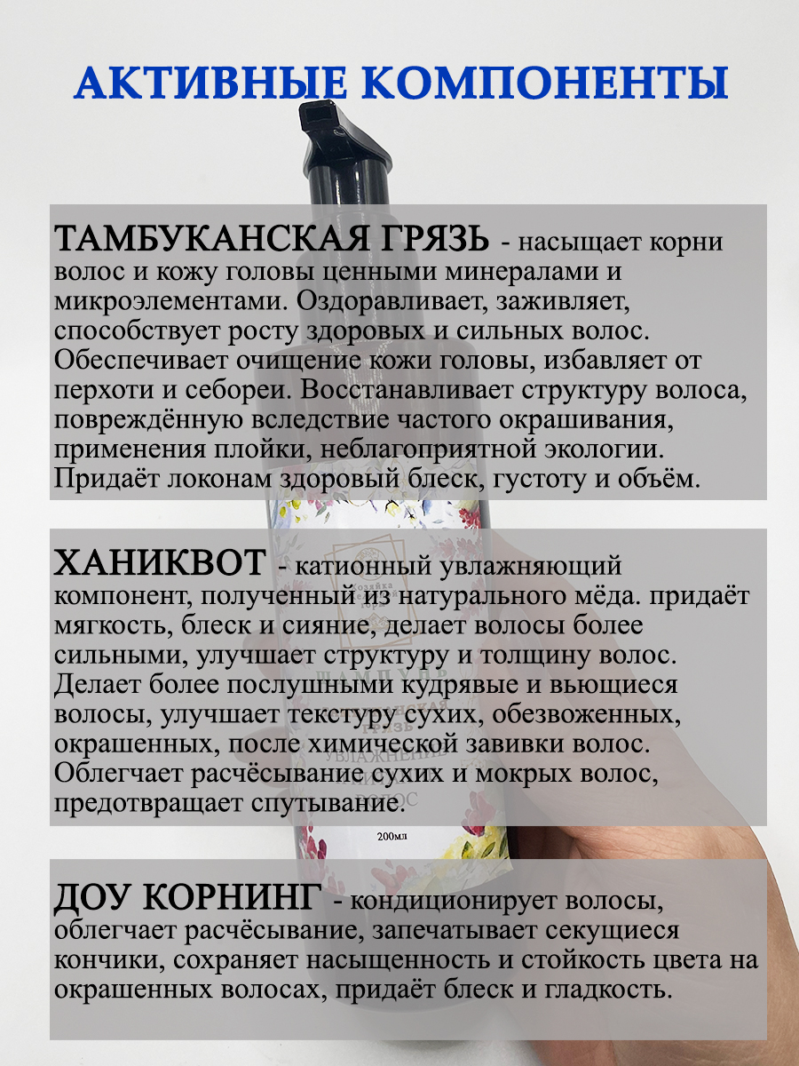 Тамбуканская грязь - насыщает корни волос и кожу головы ценными минералами и микроэлементами. Оздоравливает, заживляет, способствует росту здоровых и сильных волос. Обеспечивает очищение кожи головы, избавляет от перхоти и себореи. Восстанавливает структуру волоса, повреждённую вследствие частого окрашивания, применения плойки, неблагоприятной экологии. Придаёт локонам здоровый блеск, густоту и объём.